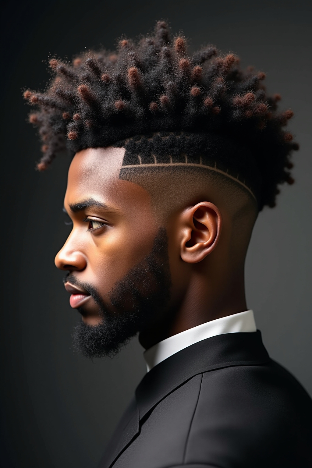 This style works best with natural 3B to 4C hair types, showcasing the contrast between textured curls and clean fade lines.