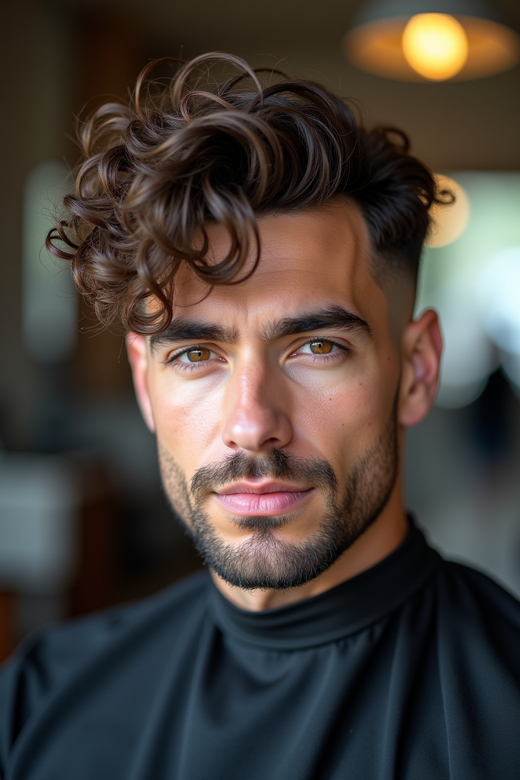The Modern Curly Taper Fade with Textured Crown combines classic tapering with contemporary styling for an eye-catching look. The gradual fade creates a clean transition from skin to fuller curls, while the textured crown maintains volume and movement on top. Styling products like curl-enhancing creams help define those natural curls and add dimension to the textured upper section. This versatile style works particularly well for men with naturally curly hair who want a polished yet effortlessly cool appearance.