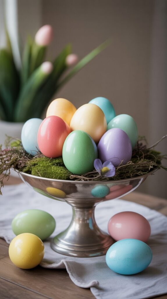 Arrange dyed Easter eggs in varying pastel shades inside a pedestal bowl or vintage compote, creating simple yet elegant centerpiece that takes minutes to assemble but delivers sophisticated visual impact instantly. Choose eggs in coordinating colors—perhaps all blues and greens, soft pinks and creams, or lavenders and yellows—maintaining color harmony that appears intentional rather than using every color randomly throughout. Add moss, small flowers, or decorative grass around eggs to soften the arrangement and provide organic texture that complements the smooth egg surfaces beautifully and naturally within the composition. This budget-friendly centerpiece works beautifully on dining tables, sideboards, or mantels, providing Easter festivity without requiring fresh flowers that wilt or elaborate construction demanding extensive time and skills. Vary egg sizes from regular chicken eggs to larger wooden or foam craft eggs for dimensional interest, or use all uniform sizes for more refined, minimalist aesthetic depending on personal preference.