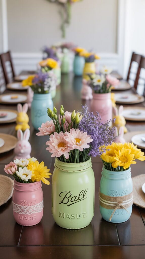 Fill multiple mason jars with spring flowers in coordinating colors, wrapping jars with ribbon, burlap, or lace before clustering them down the table’s center creating charming farmhouse-style Easter centerpiece. Paint jars in pastel chalky paint for softer look, or leave them clear showcasing flower stems and water for fresh, natural aesthetic that celebrates the blooms themselves without distraction from containers. Vary jar sizes—use quart jars for larger arrangements, pint jars for medium, and half-pint for tiny bud vases—creating dimensional interest through height variation that’s more visually dynamic than uniform sizes. Tuck decorative eggs, small bunnies, or name card holders between jars down the table, creating cohesive tablescape where centerpiece extends rather than existing as single focal point isolated in middle. This accessible DIY project requires minimal crafting skills yet delivers impressive results that look professionally styled while maintaining casual, welcoming charm perfect for family-focused Easter celebrations at home.