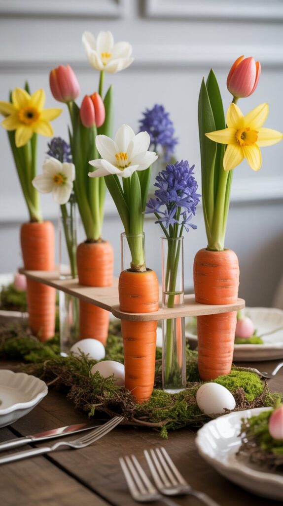 Transform humble carrots into charming vases by hollowing out their centers and filling with water and small spring flowers like tulips, hyacinths, or daffodils that create whimsical, unexpected arrangements guests will love. Select large, thick carrots that can accommodate small flower stems, carefully hollow the center using an apple corer or small knife, then insert test tubes or small vials to hold water. Arrange multiple carrot vases down the table’s length, alternating with decorative eggs, votives, or moss-covered elements creating cohesive tablescape rather than single isolated centerpiece in the middle alone. This creative approach adds playful charm perfect for Easter celebrations while showcasing spring’s fresh produce and flowers together in clever, conversation-starting displays that feel both rustic and sophisticated simultaneously. Replace flowers as they fade throughout the week, extending your centerpiece’s life beyond the single Easter meal into the days following when you continue enjoying its cheerful presence.