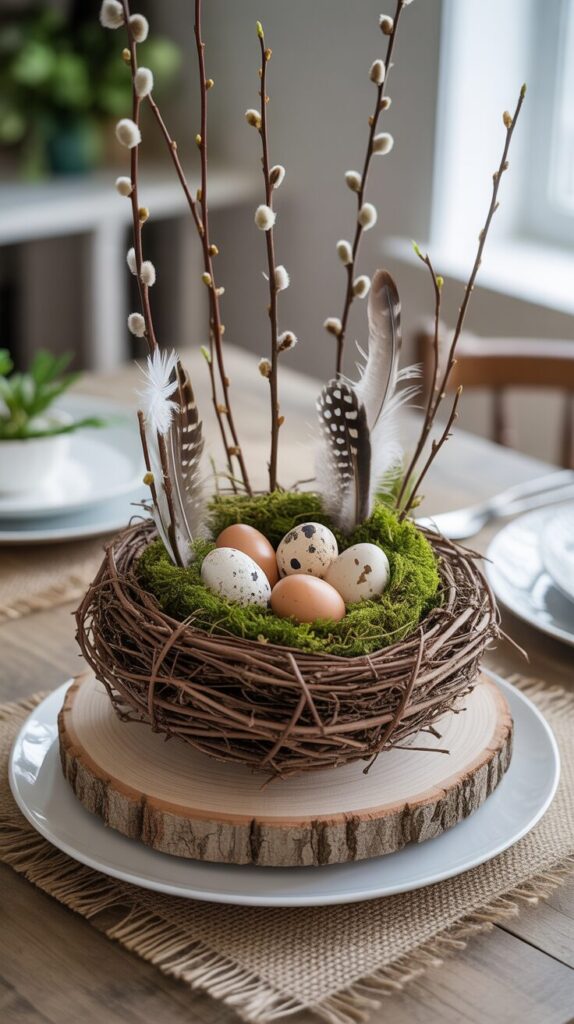 Create natural-looking bird’s nest centerpiece using grapevine wreath base, moss, twigs, and decorative eggs positioned to look nestled inside, bringing outdoor spring beauty to your indoor table beautifully. Purchase or make a small grapevine wreath (8-12 inches), stuff the center with green moss creating nest interior, then arrange speckled or solid-colored eggs nestled among the moss naturally and artfully. Add small feathers, pussy willow branches, or flowering branches extending upward from the nest creating height and movement rather than flat arrangement that lacks dimensional interest throughout its composition. Position nest on a wooden slice, piece of burlap, or layered plates creating defined base that elevates the arrangement and prevents it from disappearing against table linens or surfaces below. This nature-inspired centerpiece works beautifully with rustic, farmhouse, or cottage table settings, bringing organic textures and earthy tones that complement rather than compete with your china and table linens.