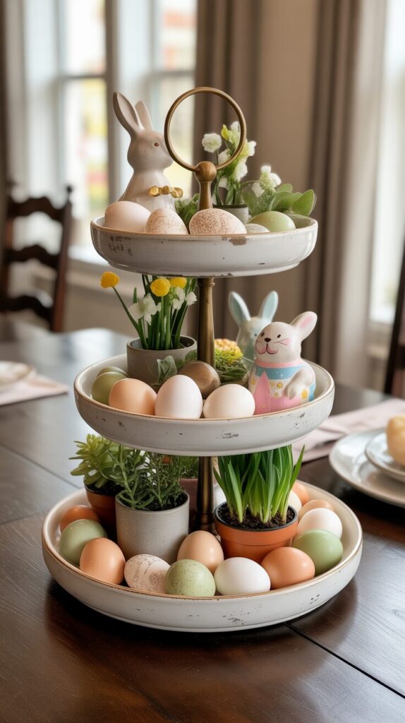 Style a three-tiered serving tray with layers of Easter elements including eggs on bottom tier, spring flowers in small vases on middle tier, and decorative bunny or seasonal figurines on top tier. This vertical arrangement creates substantial presence without consuming excessive table space, making it ideal for smaller dining areas or tables that need room for serving dishes during holiday meals with family. Coordinate items within your chosen color palette—perhaps all whites and greens for elegant simplicity, or pastels with gold accents for more festive, traditional Easter appearance that celebrates the holiday fully. Change elements throughout the season—replace eggs with small potted plants, swap flowers for different varieties, or rotate decorative pieces keeping the tiered display fresh and interesting beyond single-day celebrations. The tiered approach allows you to showcase multiple decorative elements together creating cohesive story rather than scattering unrelated items across the table creating visual chaos and cluttered appearance unintentionally.