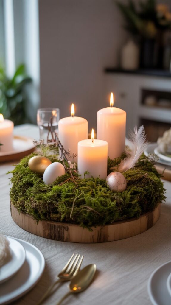 Create serene centerpiece by covering a wooden tray or shallow bowl with sheet moss, then nestling pillar candles and decorative eggs among the green creating peaceful garden-like arrangement perfect for elegant dinners. The moss provides lush green foundation mimicking spring grass, adding organic texture and natural beauty while the white or cream candles introduce height and soft ambient lighting for evening celebrations. Tuck small flowers, feathers, or delicate branches into moss around candles and eggs, creating layered composition that appears naturally grown rather than obviously arranged and decorated by human hands intentionally. This versatile design works beautifully for both casual family dinners and formal entertaining, adapting through candle choices—tapers for elegance, pillars for drama, votives for intimacy depending on occasion and preferences. Replace fresh elements as needed throughout Easter season while the moss base and candles remain constant, providing long-lasting centerpiece that evolves rather than disposable decoration discarded after single use.