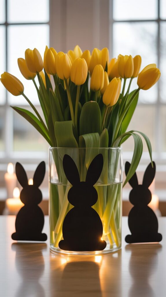 Fill a clear vase or container with yellow flowers like tulips or daffodils, then attach bunny silhouette cutout to the outside creating charming shadow effect when backlit by natural light or candles behind. Cut bunny shapes from black cardstock or vinyl using templates found online, attaching them to vase exterior with removable adhesive that won’t damage glass and allows easy removal after Easter celebrations conclude. The flowers’ golden yellow color glows through clear glass while the dark bunny silhouettes create striking contrast, especially beautiful when positioned on tables near windows where natural light illuminates arrangements from behind. Group several varying-height vases with different bunny poses—sitting, jumping, or standing—creating dynamic collection rather than single static centerpiece that lacks movement and visual interest throughout the tablescape. This modern, graphic approach appeals to those seeking Easter decorations that feel fresh and contemporary rather than traditional pastels and expected motifs that might appear dated or overly conventional.