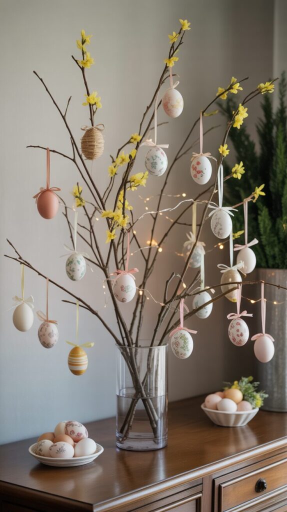 Create whimsical egg tree by arranging bare branches in a vase, then hanging decorated eggs from branches using ribbon creating three-dimensional centerpiece that draws eyes upward beyond typical horizontal arrangements. Select branches with interesting shapes—curly willow, birch, or flowering branches like cherry or forsythia that add natural beauty beyond serving merely as egg hangers throughout your Easter display. Decorate eggs using various techniques—dye them solid pastels, paint delicate patterns, or leave natural and wrap with pretty ribbon or twine creating varied textures and colors that maintain visual interest. The vertical height makes this centerpiece appropriate for buffet tables, entry consoles, or dining room sideboards where its drama won’t obstruct conversation sight lines during seated dinners with guests. Add small LED string lights woven through branches for magical evening glow, transforming the centerpiece from daytime decoration into ambient lighting that enhances your Easter celebration’s atmosphere beautifully and memorably.
