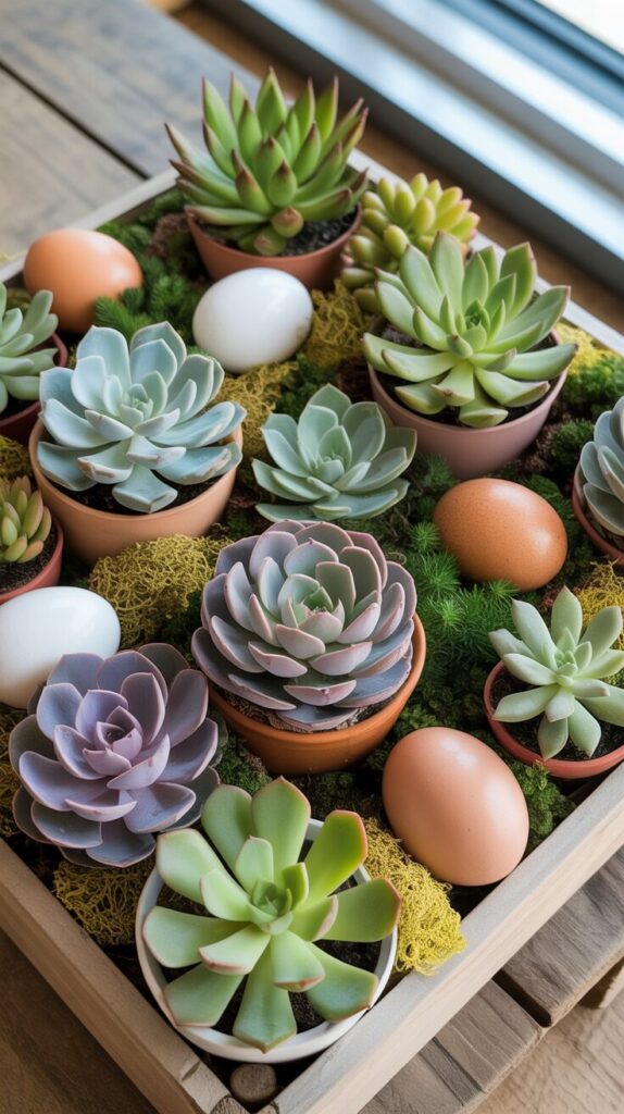 Arrange small potted succulents in a low tray or wooden box interspersed with decorative eggs creating miniature garden centerpiece that lives well beyond Easter season providing lasting beauty and practicality. Choose succulents in complementary colors—gray-green echeverias, purple sedums, or variegated varieties—that coordinate with your Easter color scheme while providing interesting textures and forms throughout the arrangement naturally. Fill gaps between succulent pots with moss, decorative rocks, or small eggs maintaining cohesive appearance while the varied elements create dimensional interest preventing flatness that makes arrangements look unfinished. This modern, eco-friendly centerpiece appeals to those seeking sustainable decorations that don’t end up in landfills after single use, instead continuing to grow and beautify homes for months. After Easter, remove eggs and keep the succulent arrangement as ongoing table decoration, perhaps adding different seasonal elements throughout the year while the plants provide constant living beauty.