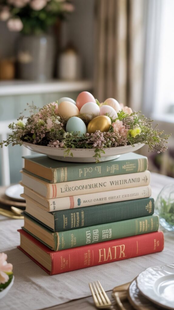 Create elevated centerpiece by stacking vintage books with spring-themed titles or pretty spines, topping with a plate or tray holding eggs, flowers, or decorative Easter elements at raised height. The books add height variation, literary charm, and vintage character while providing sturdy base that elevates your arrangement making it more visible across the table during gatherings and meals with family. Choose books with colors complementing your Easter palette—cream and pastel spines for soft romantic look, or mix in touches of green and gold for more luxurious, traditional aesthetic throughout. Top the book stack with items that won’t damage book covers—use a plate as barrier between books and any moisture from flowers or fresh elements preventing damage to beloved vintage volumes. This unexpected foundation adds personality and conversation-starting appeal while solving the common problem of flat centerpieces that disappear when dishes crowd the table during holiday feasts and celebrations.
