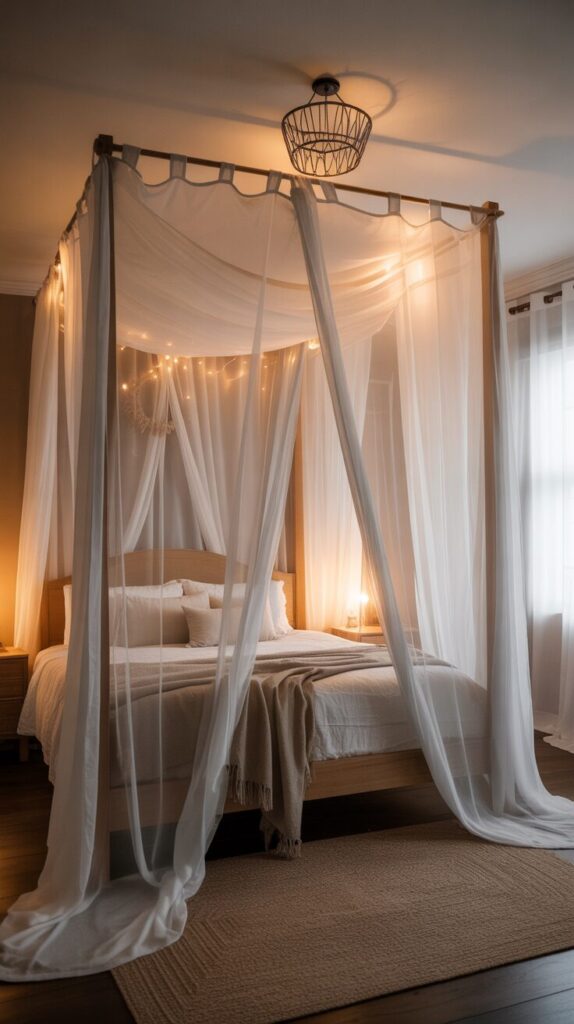 Create instant romance and drama by draping sheer, flowing fabric from the ceiling or a canopy frame over your bed, establishing a cozy cocoon that feels intimate and special. Choose lightweight fabrics like chiffon, organza, or mosquito netting in white, cream, or soft pastels that filter light beautifully and move gently with air currents throughout the room. Hang fabric from a ceiling-mounted crown canopy, traditional four-poster bed frame, or simply install curtain rods or hooks on the ceiling around your bed for affordable transformation without special furniture. The flowing fabric creates a room-within-a-room feeling that makes your bed feel like a private retreat, adding height and elegant drama to even basic bedroom spaces instantly. Style the canopy with fairy lights woven through the fabric for magical nighttime ambiance, or keep it simple and ethereal for dreamy sophistication that never goes out of style.