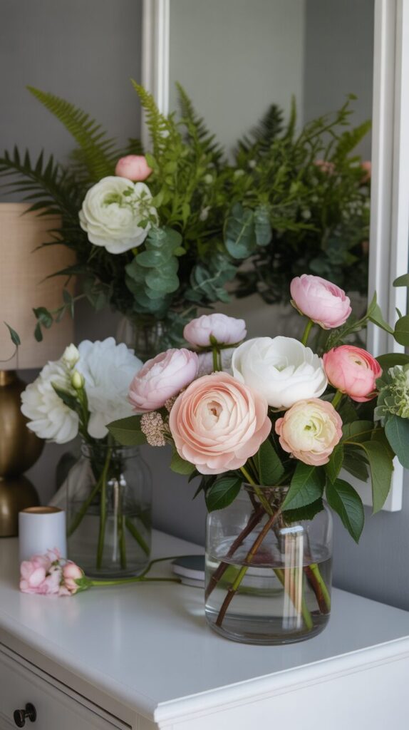 Keep fresh flowers on your nightstand, dresser, or vanity in beautiful vases that add natural beauty, pleasant fragrance, and that special touch that makes bedrooms feel cared for and luxurious daily. Choose soft-colored blooms like roses, peonies, ranunculus, or hydrangeas in whites, pinks, or pastels that complement your dreamy color palette while adding organic beauty and sweet natural fragrance throughout. Include greenery like eucalyptus, ferns, or ivy that adds life and air-purifying benefits while the lush green color provides subtle contrast against soft bedroom colors without disrupting the overall palette. Refresh flowers weekly as a self-care ritual that maintains your dreamy sanctuary, or use high-quality faux flowers if allergies or maintenance concerns prevent keeping fresh blooms readily available in your space. The presence of flowers elevates your bedroom from everyday sleeping quarters to special retreat, signaling that this space deserves beauty and attention rather than being merely functional or overlooked in your home.