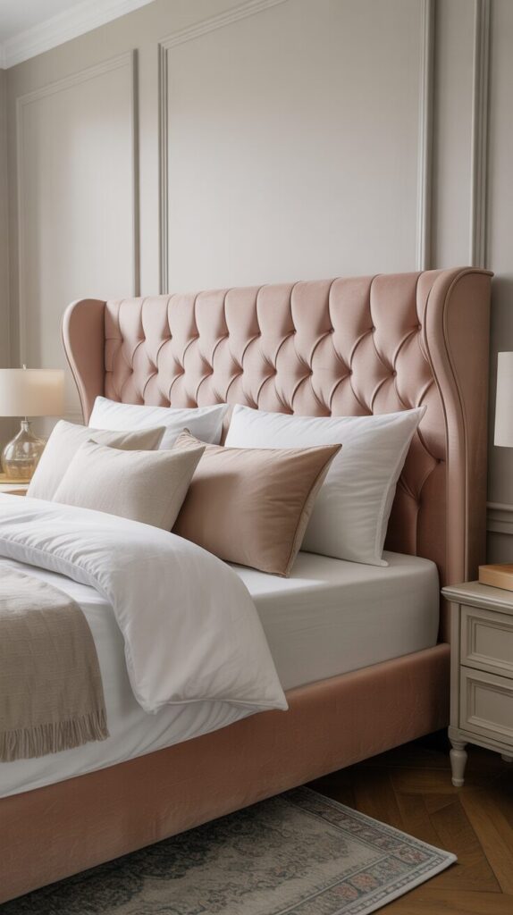 Invest in a tall, tufted upholstered headboard in luxurious fabric like velvet, linen, or faux leather that creates a soft, elegant focal point while providing comfortable support for reading in bed. Choose soft colors that complement your palette—blush velvet, cream linen, or dove gray fabric—in styles from classic tufted to modern channeled designs that suit your personal aesthetic preferences and overall bedroom design. The upholstered headboard adds softness, comfort, and instant elegance while serving practical purposes including protecting walls from pillow marks and providing cushioned support for sitting up in bed comfortably. Select a headboard that extends well above your mattress—ideally reaching 50-60 inches from the floor—to create dramatic presence and anchor your bed as the room’s undeniable focal point. This single investment piece transforms the entire bedroom, adding that hotel-luxury quality essential to dreamy spaces while providing comfort and style that justifies the expense through daily enjoyment and use.