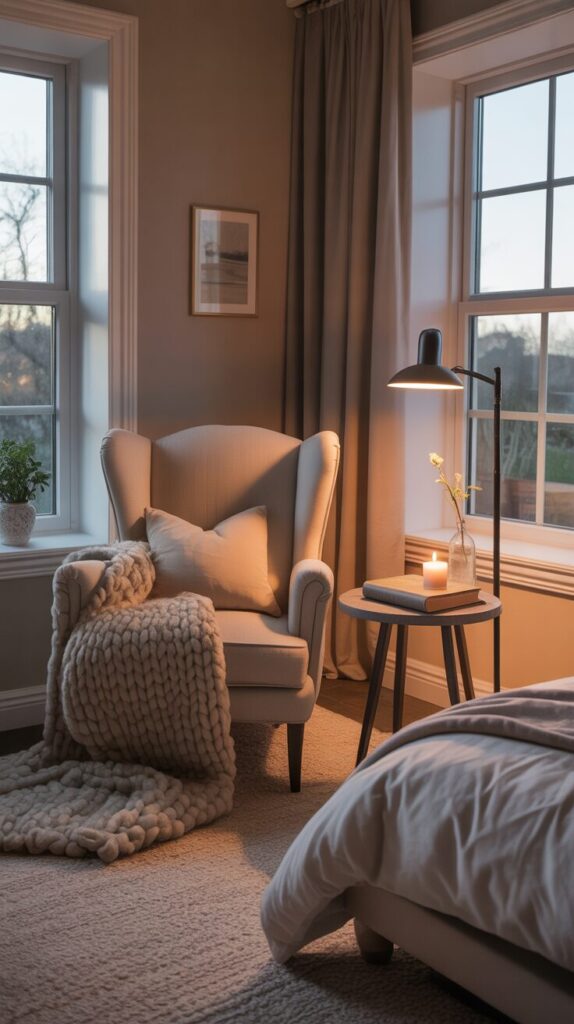 Create a dedicated corner for reading and relaxation by positioning a comfortable chair, small side table, floor lamp, and soft throw blanket near a window or in an unused bedroom corner. Choose an upholstered armchair or vintage wingback in coordinating fabric, add a plush cushion, drape with a chunky knit or faux fur throw, and position good lighting for reading without eyestrain. This personal retreat within your bedroom provides a place to unwind before sleep, enjoy morning coffee, or simply sit and daydream while gazing out windows at the world beyond your dreamy sanctuary. Style the side table with a small stack of favorite books, a candle, and perhaps a small plant or bud vase with a single flower for beautiful, functional arrangement that serves your needs. The reading nook transforms your bedroom from purely sleeping space into a true retreat where you can spend quality time relaxing, reflecting, and enjoying the peaceful beauty you’ve created throughout.