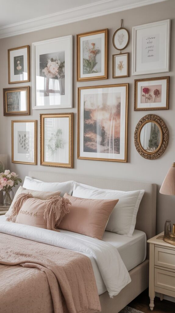 Create a curated gallery wall featuring artwork, photographs, mirrors, and decorative objects in cohesive frames that adds personality while maintaining the dreamy, romantic aesthetic throughout your personal sanctuary space. Choose art with soft subjects like florals, landscapes, abstract watercolors, or romantic quotes in frames with coordinating finishes—all white, all gold, or mixed metallics—that create unified appearance despite varied content. Include personal photographs in beautiful frames, vintage botanical prints, pressed flowers in shadow boxes, or mirrors in ornate frames that reflect light and add functional elements to your decorative display. Arrange the gallery wall above your bed, on a large blank wall, or even leaning on a dresser or shelf for more casual, changeable arrangement that evolves with your preferences over time. This personalized element makes your dreamy bedroom uniquely yours rather than generic hotel-like space, adding character and meaning while maintaining the soft, beautiful aesthetic that defines truly special sleeping sanctuaries.