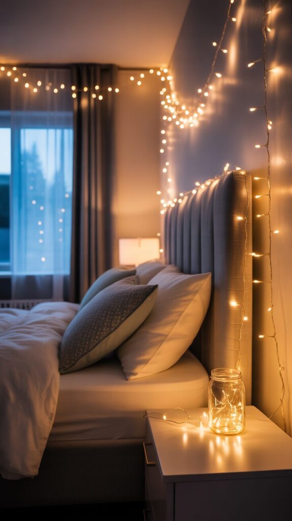 Transform your bedroom into a magical space by incorporating warm white string lights or fairy lights along headboards, draped across walls, or woven through furniture for enchanting nighttime glow. Choose warm-toned bulbs rather than cool white or colored lights, creating cozy, inviting ambiance that promotes relaxation rather than harsh brightness that disrupts your sleep preparation rituals. Drape lights behind sheer curtains for diffused glow, wrap them around bed posts, hang them in cascading strands down walls, or arrange them in mason jars on nightstands for creative variations. The soft, twinkling illumination creates magical atmosphere perfect for unwinding before sleep, reading in bed, or simply enjoying your dreamy space during evening hours when overhead lights feel too harsh. Install dimmer switches or use battery-operated lights with timers so the dreamy lighting automatically turns off after you’ve fallen asleep peacefully each night without worry.