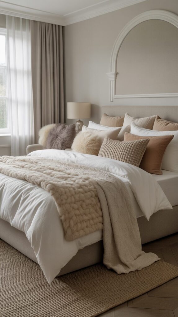 Create hotel-worthy luxury and irresistible comfort by layering multiple bedding elements including high-thread-count sheets, plush duvet, decorative coverlet, textured throw blankets, and abundant pillows in varying sizes. Start with quality cotton or linen sheets in white or soft neutrals, add a fluffy down or down-alternative duvet, layer a velvet or quilted coverlet at the foot, then finish with throws and numerous pillows. Mix textures including smooth cotton, nubby linen, soft velvet, chunky knits, and faux fur to create visual and tactile interest that makes your bed irresistibly inviting and comfortable always. Include decorative pillows in various sizes—euro shams, standard shams, lumbar pillows, and accent pillows—arranged thoughtfully rather than haphazardly for polished, intentional appearance that looks professionally styled. This abundant layering creates that coveted “sink into luxury” feeling that defines dreamy bedrooms, making your bed the star attraction and ultimate comfort destination in your home sanctuary.