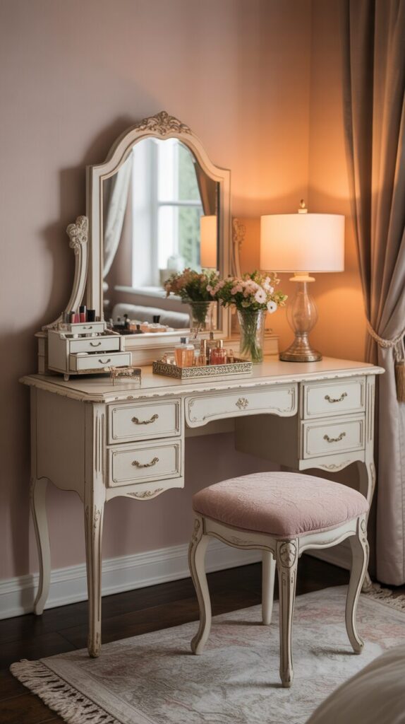 Include a romantic vanity or dressing table with an ornate mirror, comfortable upholstered stool, and beautiful organization for cosmetics and jewelry that adds feminine elegance to your dreamy bedroom. Choose a vintage or vintage-inspired piece with curved legs, decorative details, and perhaps a distressed painted finish in white, cream, or soft pastels that complement your overall color scheme. Style the vanity surface with pretty trays organizing perfumes, a vintage-style jewelry box, a small vase of fresh flowers, and an elegant table lamp that provides task lighting for grooming. Position the vanity near a window for natural light during daytime routines, or ensure adequate artificial lighting from sconces or a beautiful table lamp that illuminates without harsh brightness. This dedicated beauty area adds old-world elegance and practical functionality while creating a space for self-care rituals that enhance the dreamy, pampering atmosphere you’re cultivating in your bedroom sanctuary.