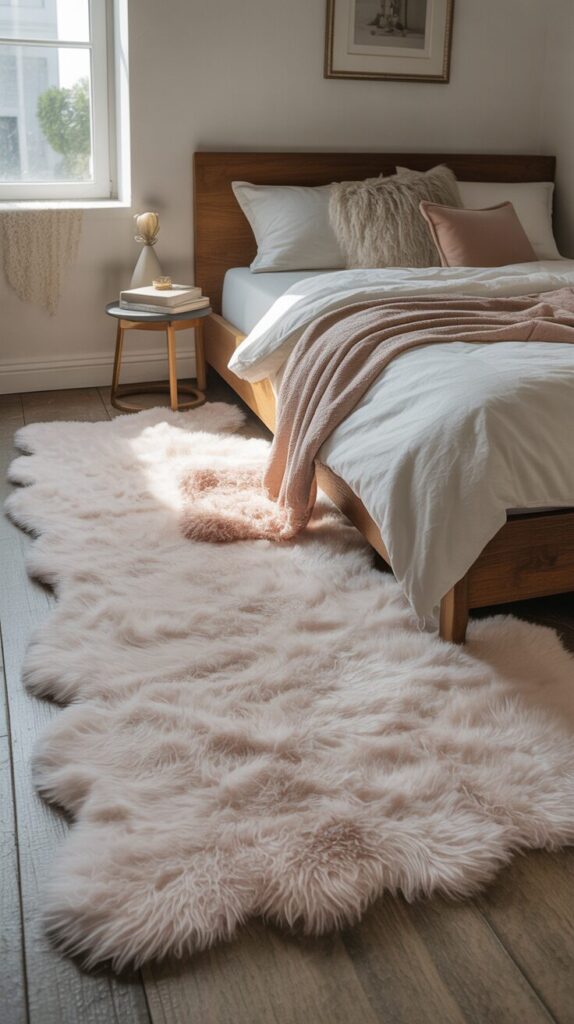 Ground your dreamy bedroom with a soft, plush area rug in neutral tones or subtle patterns that adds warmth, comfort, and luxury underfoot the moment you step out of bed each morning. Choose high-pile rugs, faux sheepskin, or thick shag in white, cream, blush, or soft gray that feels indulgent and cozy against bare feet, encouraging you to linger rather than rush through your space. Position the rug under the bed extending out on three sides, or place it entirely in front of the bed as a landing pad that defines the sleeping area beautifully and functionally. The plush texture adds another layer of luxury and comfort to your dreamy bedroom while the soft color contributes to the overall calm, cohesive aesthetic you’re building throughout the space. Consider layering a smaller vintage or patterned rug over a larger neutral plush one for added visual interest and that collected, personalized look that makes spaces feel special and unique.
