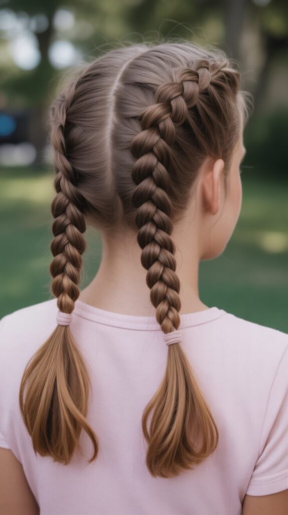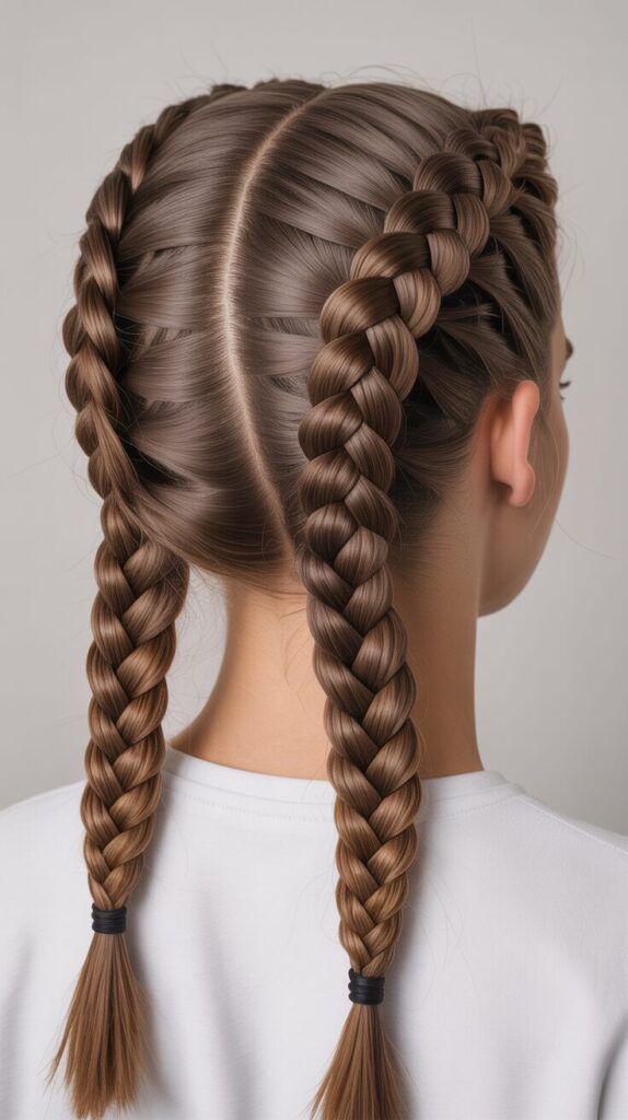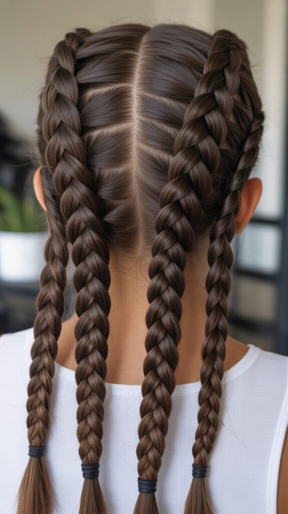 The classic double Dutch braids are the foundation of Dutch braid styling, featuring two parallel braids that run from the hairline down the back of the head in perfect symmetry. This iconic style involves parting the hair down the center and creating a Dutch braid on each side, keeping the braids tight and even for a polished, athletic look. The double Dutch braids sit raised on top of the head, creating a bold, three-dimensional effect that’s both sporty and chic, making them perfect for workouts, casual outings, or festival wear. This versatile style keeps hair completely secured and off your face while looking intentionally styled rather than thrown together, making it ideal for busy days when you need your hair to stay put. Best suited for medium to long hair of any texture, double Dutch braids can last for days with proper care, making them a favorite for those seeking low-maintenance styles that still look polished and put-together.