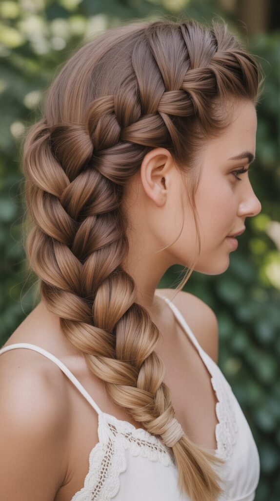 The side Dutch braid offers an asymmetrical, romantic alternative to centered braids by sweeping all the hair to one side for a soft, feminine look. This style begins at the hairline near one temple and continues diagonally across and down the head, ending at the opposite shoulder with the braid draped elegantly over one side. The diagonal placement creates visual interest and draws the eye across the face in a flattering way, making this style particularly photogenic and perfect for special occasions. The side Dutch braid can be worn sleek and tight for a more polished appearance or gently loosened for a softer, more relaxed bohemian vibe that’s perfect for beach weddings or garden parties. Ideal for all face shapes and particularly flattering on square and round faces that benefit from the diagonal lines, this style works best on medium to long hair and can be adorned with flowers, ribbons, or jeweled pins for extra glamour.