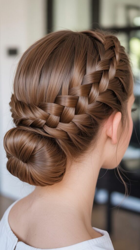 The Dutch braid bun elegantly combines the texture of a Dutch braid with the sophistication of a classic bun, creating a polished updo that’s perfect for professional settings and formal events. This style typically features one or two Dutch braids that travel from the hairline toward the crown or nape, where the remaining hair is then wrapped and pinned into a bun. The braid adds visual interest and dimension to what might otherwise be a simple bun, creating a more complex and intentional hairstyle that looks like you spent hours in front of the mirror. This versatile updo works beautifully for weddings, business meetings, dance performances, or any occasion where you need your hair completely secured in an elegant, flattering style. Perfect for medium to long hair of any texture, the Dutch braid bun can be created as a low bun for classic sophistication, a high bun for ballet-inspired elegance, or a side bun for romantic asymmetry.