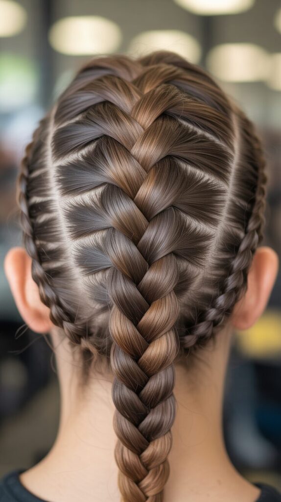 The mohawk Dutch braid creates an edgy, fierce look by braiding a strip of hair down the center of the head while leaving the sides sleek or even partially shaved for maximum impact. This bold style features a single, prominent Dutch braid that runs from the hairline straight back down the center, creating a raised, three-dimensional mohawk effect without actually shaving your head. The sides are typically slicked down smooth or styled in smaller braids, creating contrast that makes the center braid stand out even more dramatically. This statement-making style has become popular in athletic settings, music festivals, and among those who want an edgy look that’s still feminine and sophisticated. Best suited for those with medium to thick hair and works on various lengths, the mohawk Dutch braid is perfect for anyone wanting to make a bold style statement while keeping their hair completely secured and manageable.