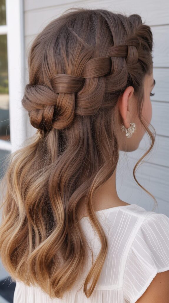 The Dutch braid half-up half-down style perfectly balances secured hair with flowing locks, creating a romantic look that’s ideal for dates, parties, and everyday elegance. This versatile style features one or two Dutch braids starting at the temples or crown and traveling back toward the center of the head, where they’re secured together, leaving the remaining hair flowing loose and free. The braided top section keeps hair off your face while adding texture and interest, while the loose bottom half maintains movement and femininity. This style is particularly flattering because it combines the security and polish of an updo with the softness and romance of wearing your hair down. Perfect for all hair lengths (as long as you have enough length to braid) and all face shapes, this half-up style works beautifully with natural texture, loose curls, or sleek straight hair, and can easily be dressed up with flowers, clips, or jeweled bobby pins.