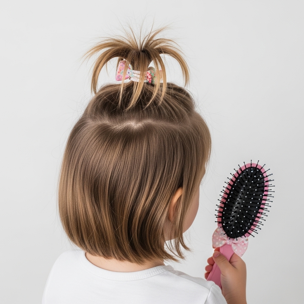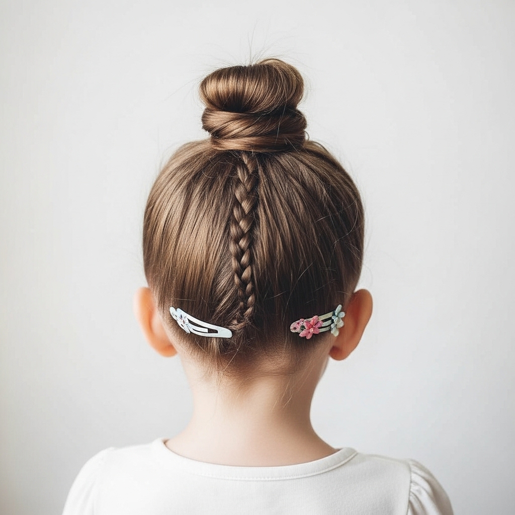 A mini top knot is trendy and keeps hair neatly secured. Pull the hair to the crown, twist it, and secure it into a small bun. This style is comfortable for toddlers and perfect for active play. You can pair it with small braids or hair clips for extra flair. Quick, chic, and practical.