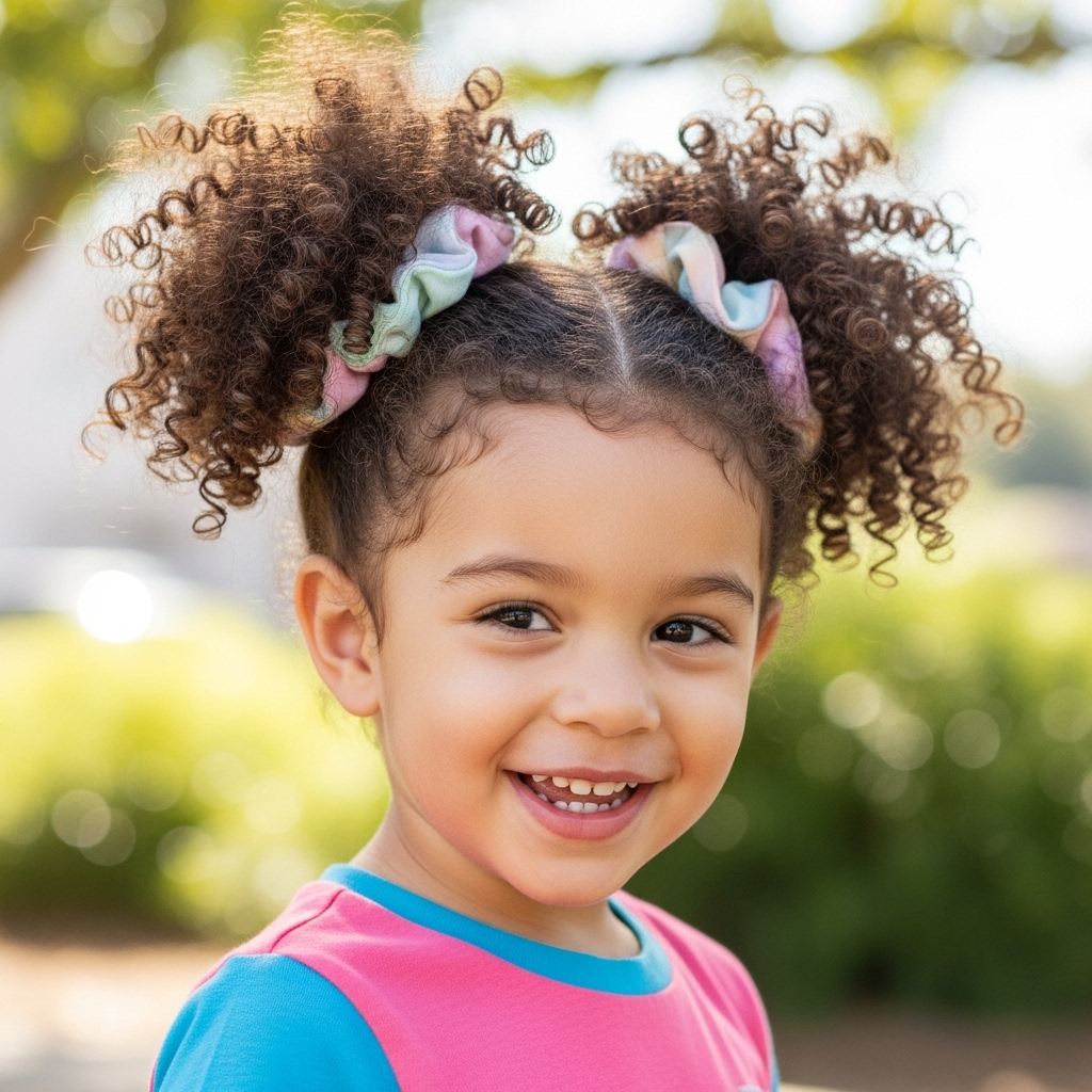 Curly puff ponytails are ideal for toddlers with curly or coily hair. Section the hair and tie each puff gently with a soft band. It highlights natural curls and keeps hair manageable. Low-maintenance and playful, it’s perfect for everyday wear or outdoor activities.