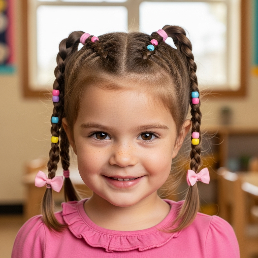 Braided pigtails combine style and practicality. Divide the hair into two sections and braid each side. The style keeps hair tidy and reduces tangles. You can accessorize with colorful beads or bows. This look is perfect for preschool, playdates, and special events.