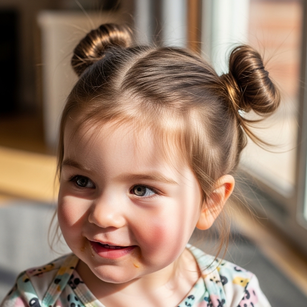 Space buns are fun and playful for toddlers. Part the hair in the middle and twist each side into a small bun. This style keeps hair away from the face and adds a creative touch. It’s perfect for birthdays, parties, or casual days. Comfortable, secure, and absolutely adorable.