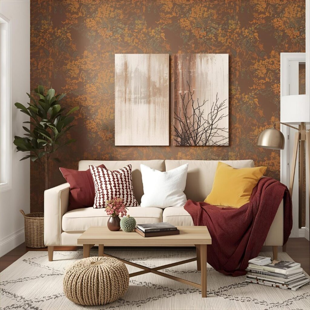 Bring the beauty of fall indoors with shades of burnt orange, mustard yellow, and deep burgundy. These colors instantly set a seasonal tone while making small apartments feel cozy. Accent walls, throw pillows, or small decor pieces are perfect for adding warmth. Pairing these shades with neutrals keeps the space balanced.