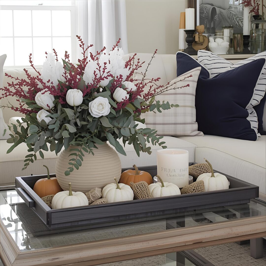 Small dining tables or coffee tables can showcase fall themes without clutter. Mini pumpkins, candles, or rustic trays add instant seasonal style. Keeping arrangements low-profile ensures practicality for everyday use. Tabletop accents are a great way to decorate in small spaces.