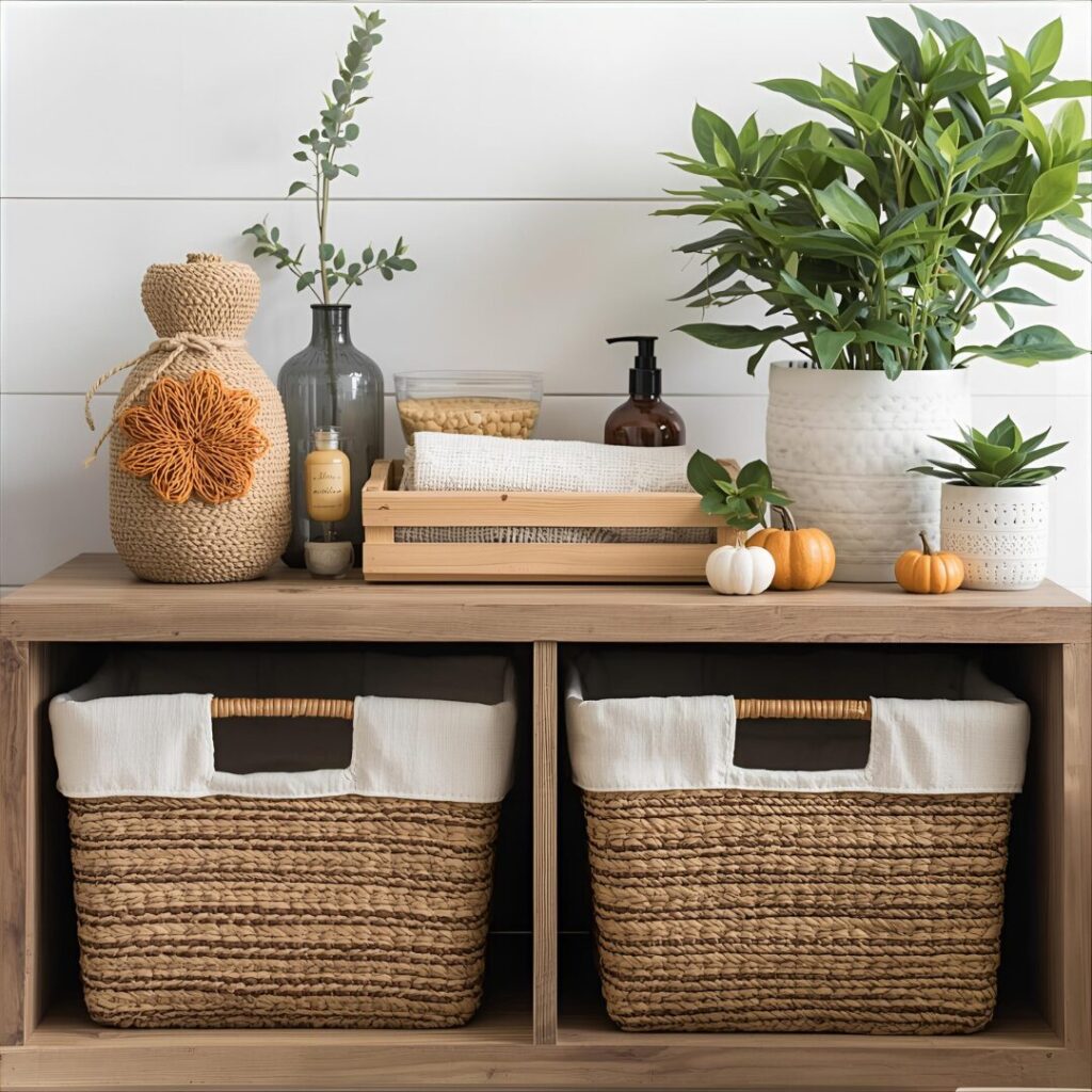Storage can double as decor with the right pieces. Woven baskets, wooden crates, or fabric bins in autumn shades provide both organization and seasonal charm. These elements keep the bathroom tidy while enhancing the fall aesthetic. They also make essentials easily accessible.
