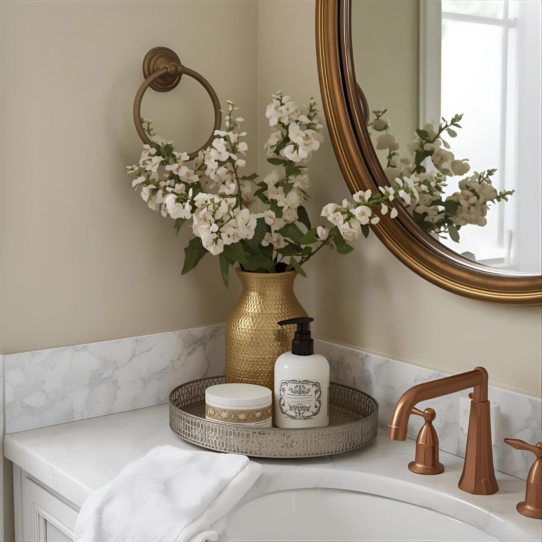 Touches of copper, bronze, or gold add subtle sophistication to a fall bathroom. Metallic soap dispensers, trays, or mirror frames reflect light beautifully. They pair well with earthy tones, giving the space balance. Small metallic accents can elevate the entire design.