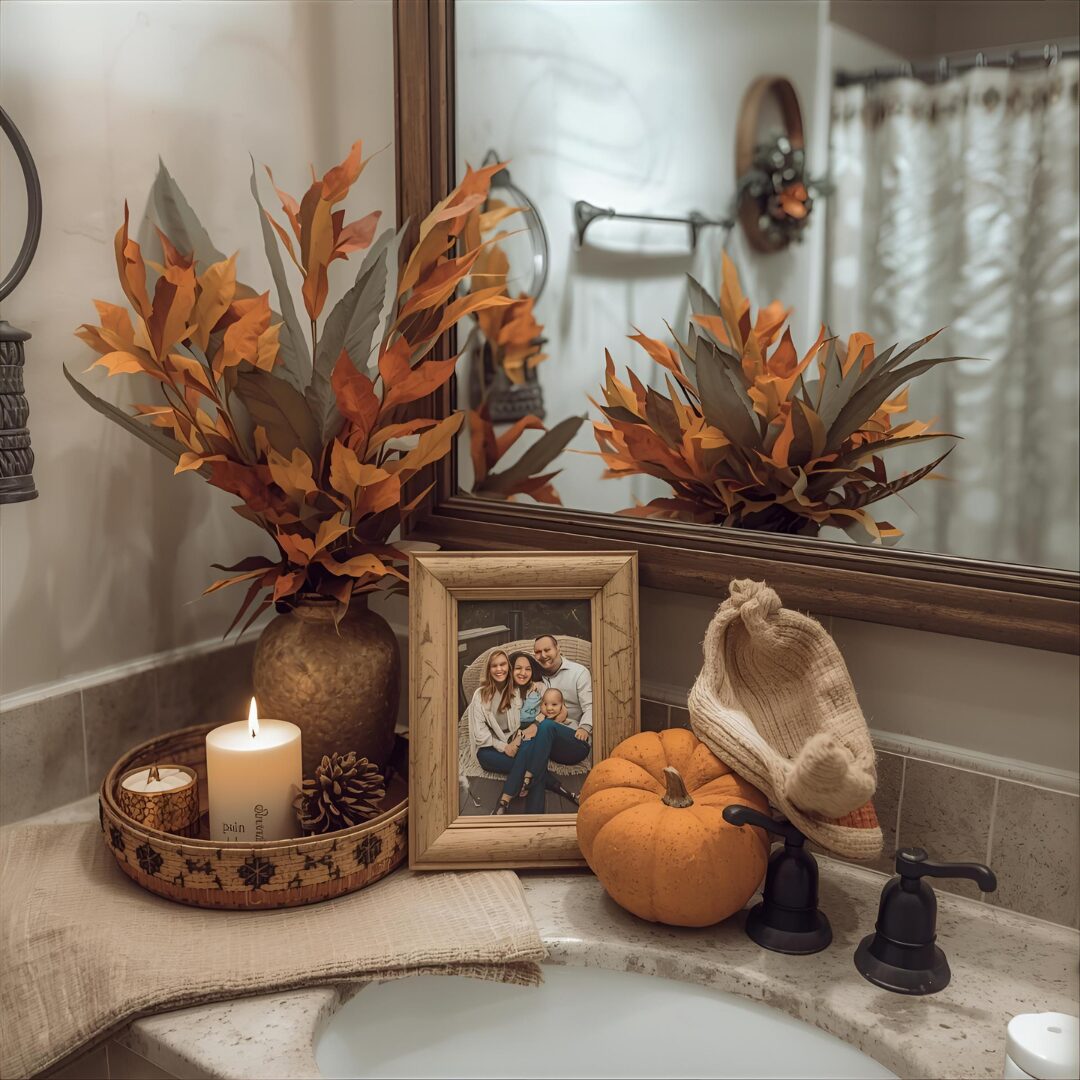 Adding personal items styled with seasonal accents makes the bathroom feel unique. Family photos in rustic frames or small DIY crafts can bring warmth. These touches balance practicality with personality. They ensure your fall bathroom decor feels authentic and inviting.