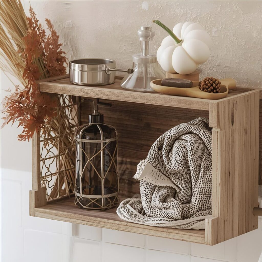 Incorporating wood elements adds warmth and a natural fall vibe. Wooden shelves, trays, or storage baskets enhance both style and function. The natural grain complements autumn’s earthy tones perfectly. Even small pieces bring rustic charm into your bathroom.