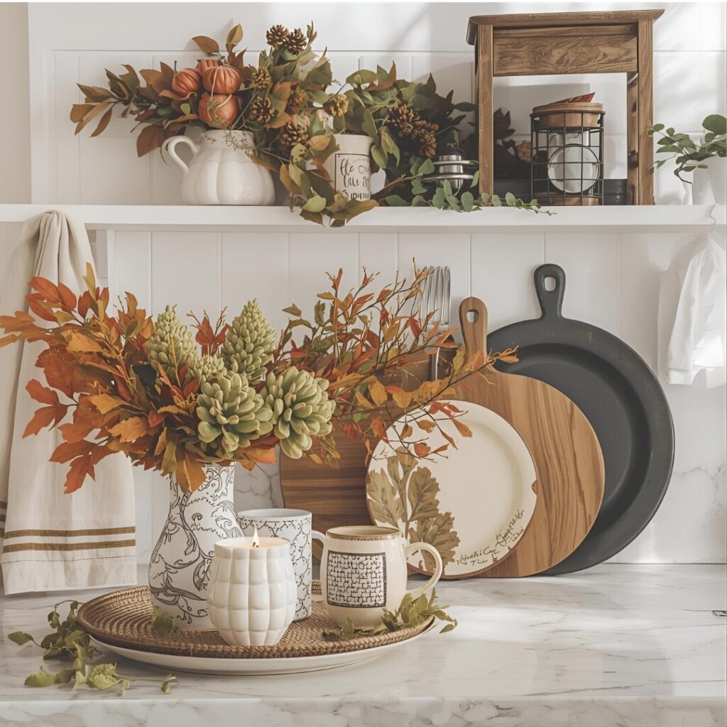 The kitchen is a great spot for small seasonal updates. Add fall-colored dish towels, rustic cutting boards, or small arrangements. These details make the space festive without crowding counters. Even mugs or plates in autumn tones enhance the seasonal vibe.