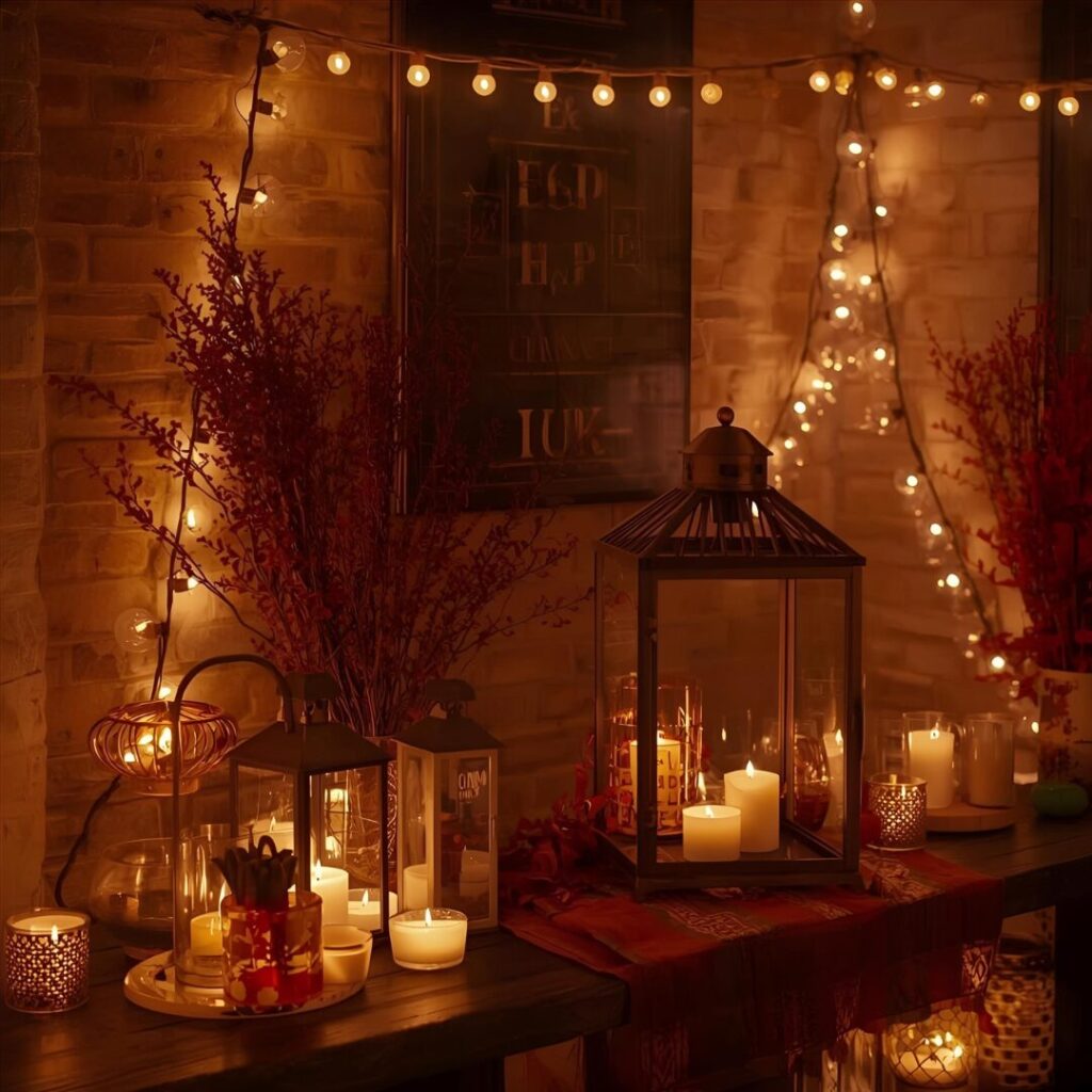 Lighting sets the mood for cozy fall evenings. Candles, lanterns, and warm-toned bulbs create a relaxing atmosphere. Layering lighting at different heights enhances dimension and comfort. This setup is perfect for intimate gatherings or quiet nights at home.