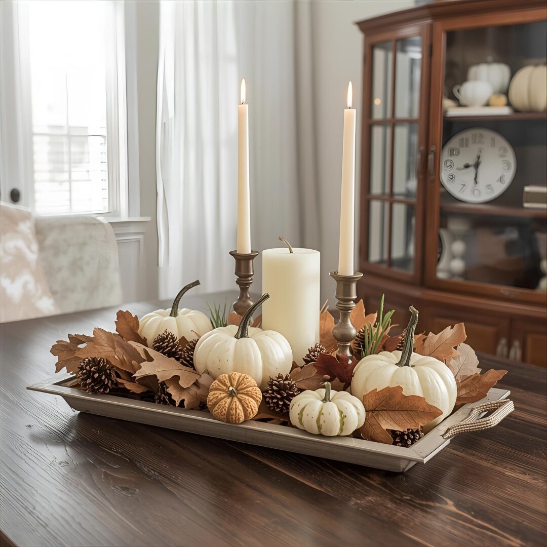 A thoughtful centerpiece brings autumn charm to dining or coffee tables. Mix pumpkins, candles, and foliage in trays for balance. Centerpieces make spaces feel styled yet functional for daily living. Seasonal arrangements can be swapped out easily as the holidays approach.