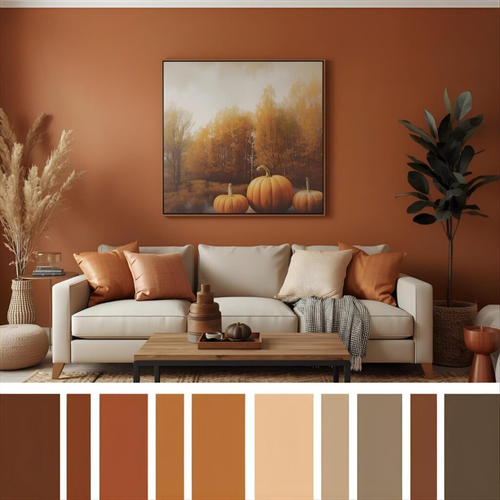Deep oranges, warm browns, and muted yellows instantly create a fall-inspired living room. These shades mimic the changing leaves and bring natural warmth indoors. Pairing these tones with neutrals keeps the space balanced and sophisticated. Adding color through pillows, rugs, or accent walls is an easy way to refresh.