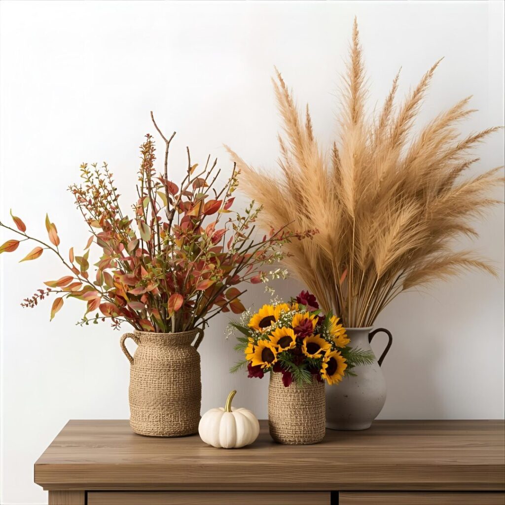 Adding fall foliage or dried arrangements brings nature indoors. Think branches with colorful leaves, pampas grass, or arrangements of sunflowers. These natural touches create a soft, organic look. Pairing greenery with rustic vases or baskets enhances the cozy vibe.