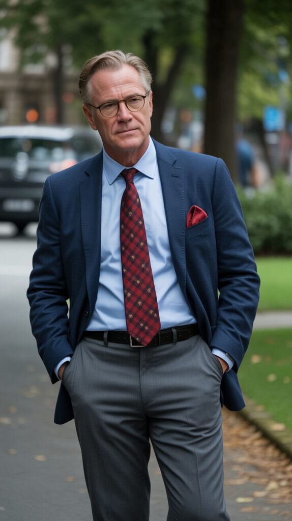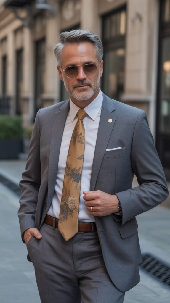 Charcoal gray offers a subtle, refined appeal. It is perfect for business meetings or formal dinners. Adding a patterned tie gives character without appearing too bold. Men in their 50s can rely on this combination for everyday professional elegance.