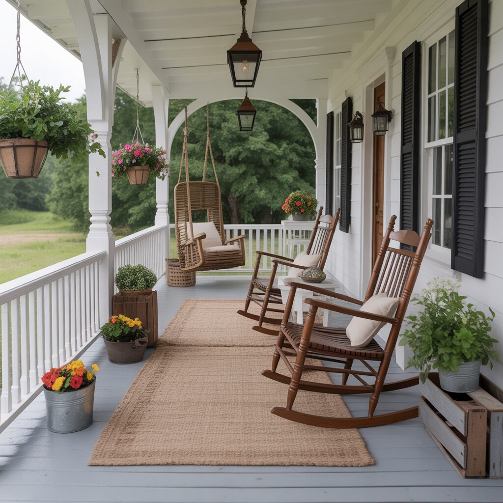 Rustic wood accents, white paint, and layered rugs create a classic farmhouse look that feels both welcoming and timeless. Rocking chairs or a porch swing add instant charm while also offering comfort. Hanging planters or lanterns give the porch extra warmth. This style is perfect for homes seeking a cozy, country-inspired vibe.