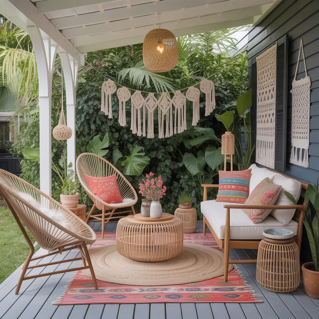 A boho porch thrives on layers, patterns, and relaxed vibes. Woven rugs, rattan chairs, and colorful cushions create a playful yet cozy atmosphere. Macramé wall hangings or lanterns can add artistic touches. This style feels casual, personal, and perfect for lounging outdoors.