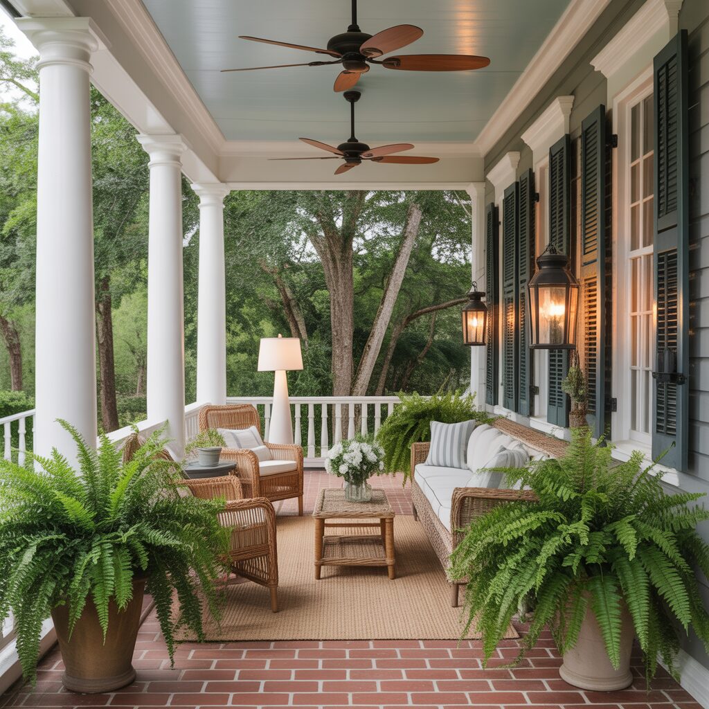 Columns, wicker furniture, and ceiling fans make a Southern-inspired porch timeless. Neutral paint paired with lush greenery enhances the refined look. Traditional lanterns and shutters add an extra touch of elegance. This design creates a space that feels graceful and welcoming.