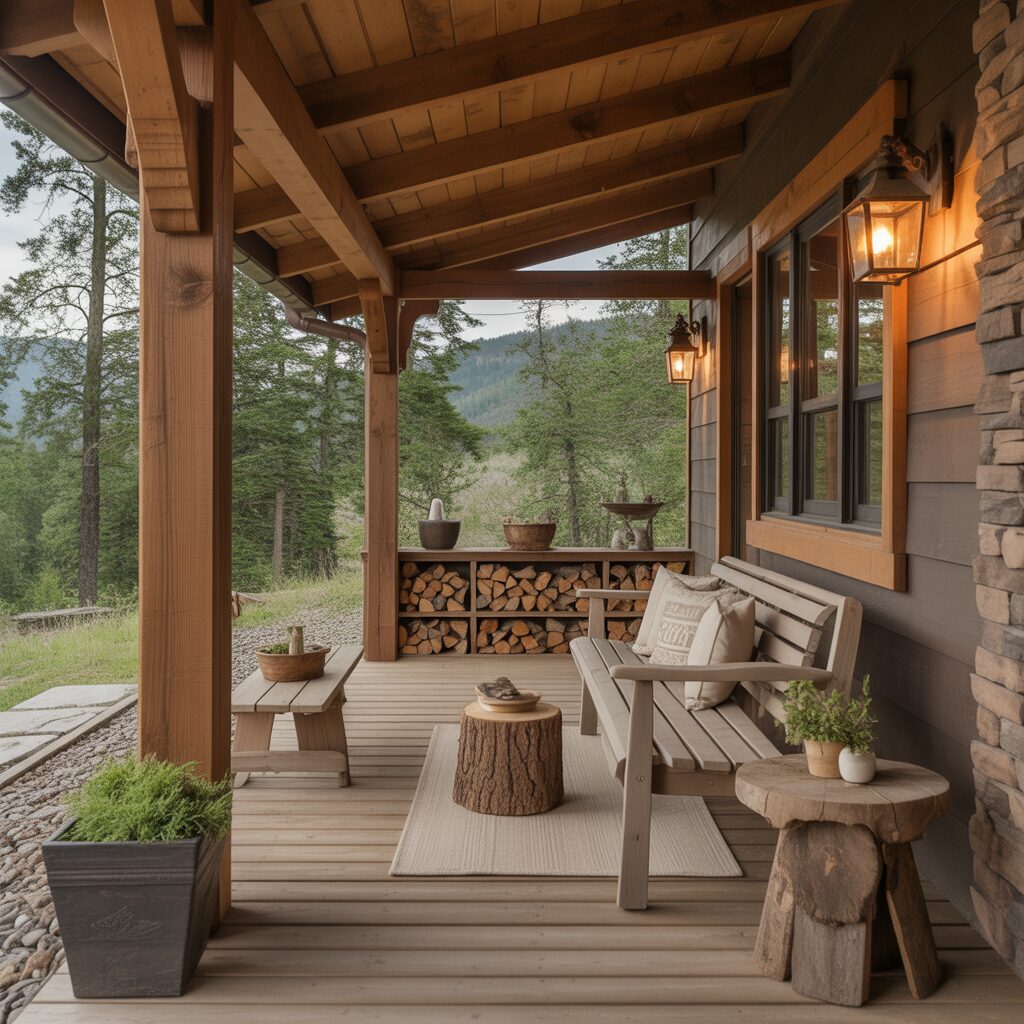 Natural wood, stone accents, and earthy tones bring a mountain-lodge vibe to your porch. Lantern lighting and a rustic porch swing add to the cozy appeal. This style blends beautifully with nature, making the porch feel like part of the landscape. It’s warm, grounded, and adventurous.