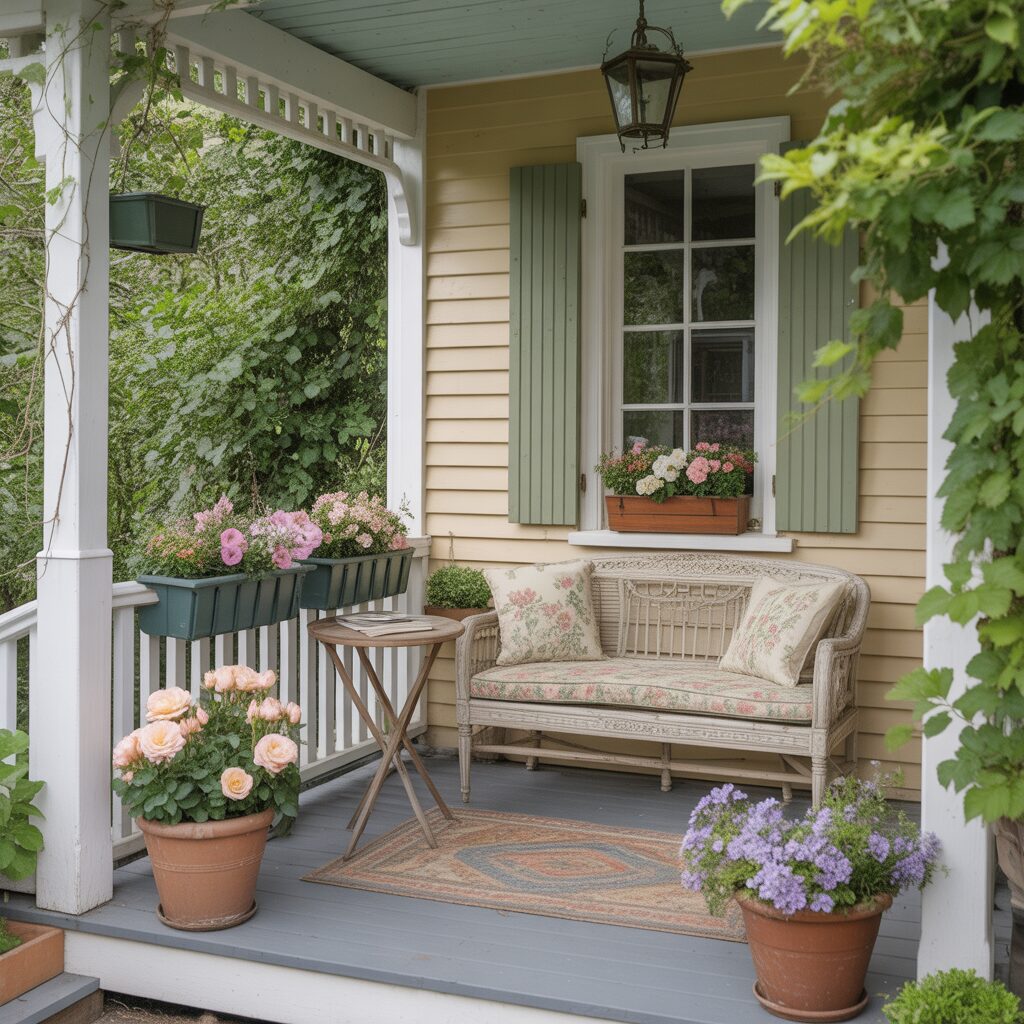 A cottage-inspired porch shines with floral arrangements, vintage furniture, and soft pastel colors. Flower boxes on railings and climbing vines enhance the charm. The look is both romantic and inviting, offering a cozy atmosphere for relaxation. It’s a perfect blend of nature and style.