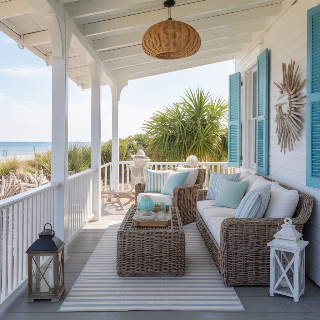 Coastal porches use light colors, breezy fabrics, and natural textures. White railings, wicker seating, and nautical accents like lanterns or rope details capture the seaside vibe. Adding light blue cushions and striped rugs enhances the beachy aesthetic. This look feels fresh and calming.
