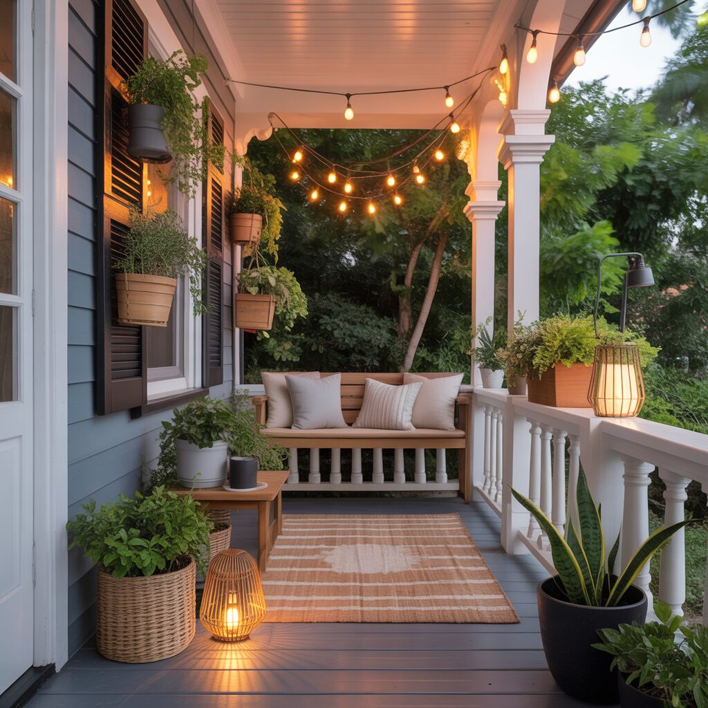 Even compact porches can shine with thoughtful design. A slim bench, vertical planters, and layered mats create both style and function. String lights or lanterns make the porch cozy at night. The key is maximizing every inch while keeping the space open and uncluttered.