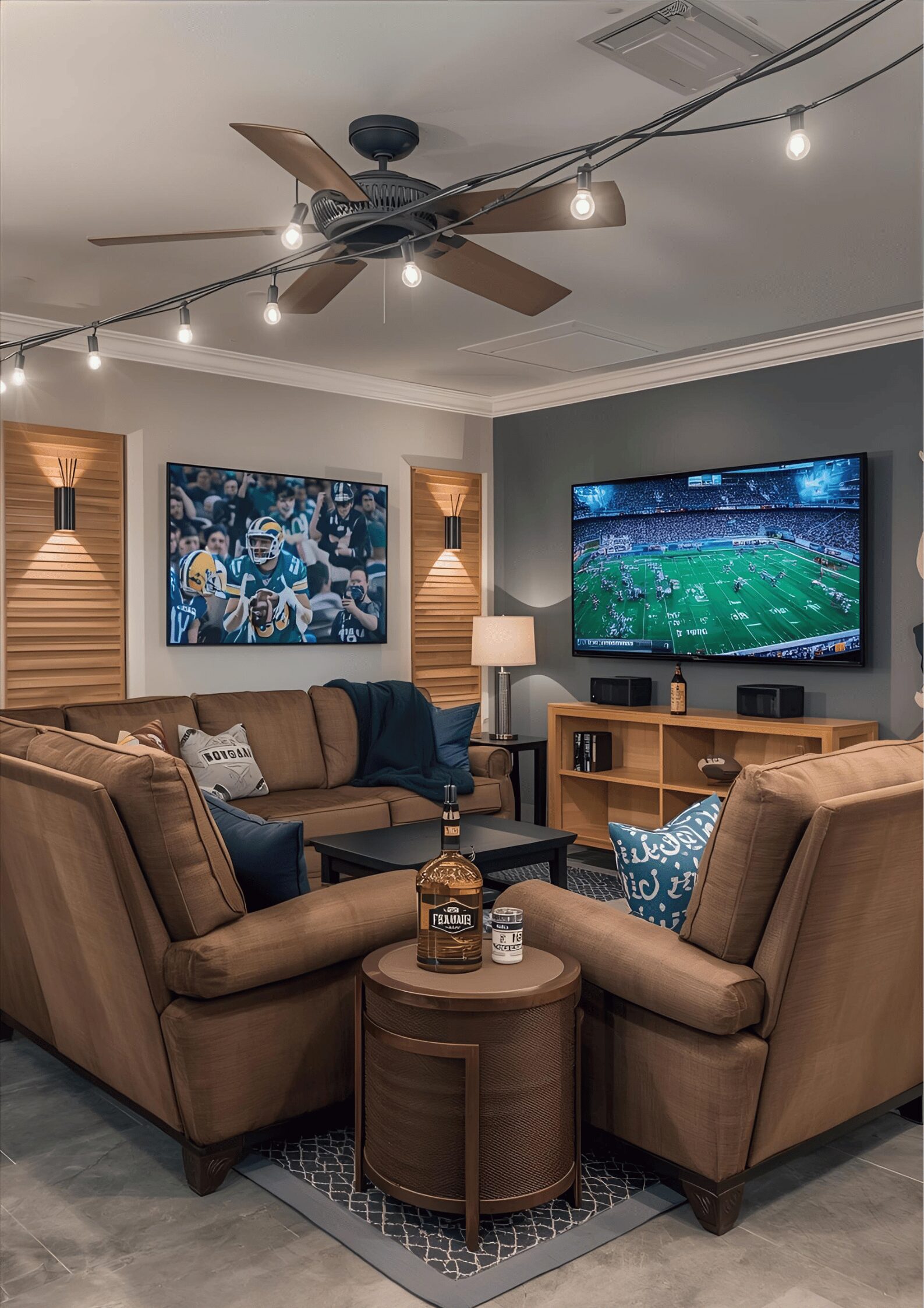 Transform your garage into the best seat in the house for every big game by mounting a large-screen smart TV for optimal viewing. Incorporate comfortable and durable seating options like a large sectional sofa or recliners to accommodate all your guests. Keep drinks cold and within arm’s reach with a dedicated mini-fridge or a compact kegerator to eliminate constant trips inside. Enhance the energetic atmosphere with your favorite team memorabilia, string lights, and acoustic panels to manage sound. Ensure you have strong Wi-Fi for seamless streaming and to keep up with live fantasy sports updates throughout the event.